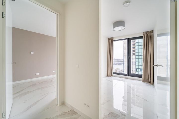 Entree op begane grond met eigen brievenbus en pakketjes-box. Lift naar de zestiende verdieping. Hal met toegang tot gastentoilet, ruime bijkeuken en bergkamer. De entree naar de woonkamer is overweldigend, de ramen van vloer tot plafond zorgen ervoor dat er veel licht de woning binnenkomt.