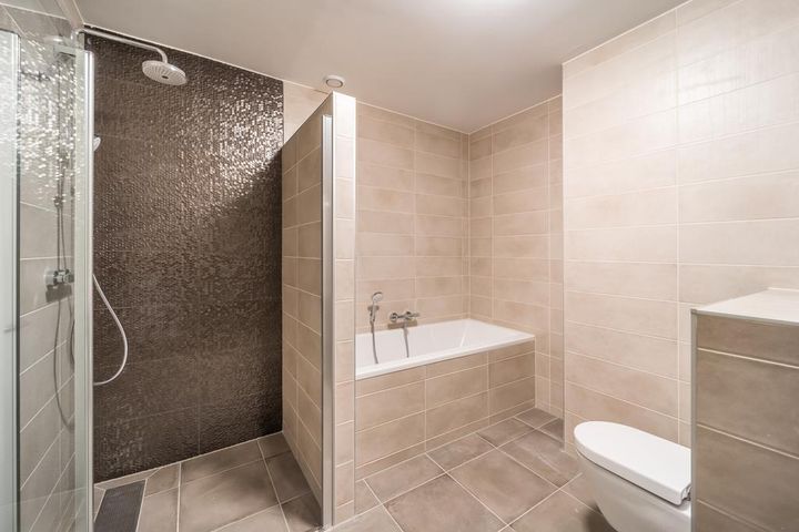 De high-end badkamer is voorzien van een ligbad, inloopdouche, dubbele wastafel met meubel en een tweede toilet.